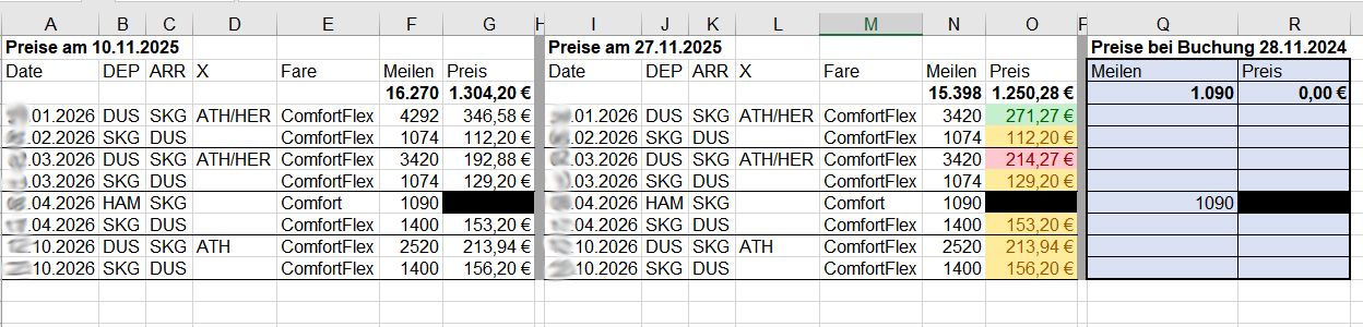 Die Tabelle links zeigt echte Werte vom 10. November 2025 im Vergleich zur Nacht vom 26. auf den 27. November. Der Großteil der Thessaloniki-Verbindungen blieb preislich unverändert. Eine Verbindung wurde um 21,39 Euro teurer, eine andere sank gleichzeitig um 75,31 Euro. Unter dem Strich ergibt sich in diesem Zeitraum sogar ein Preisrückgang.